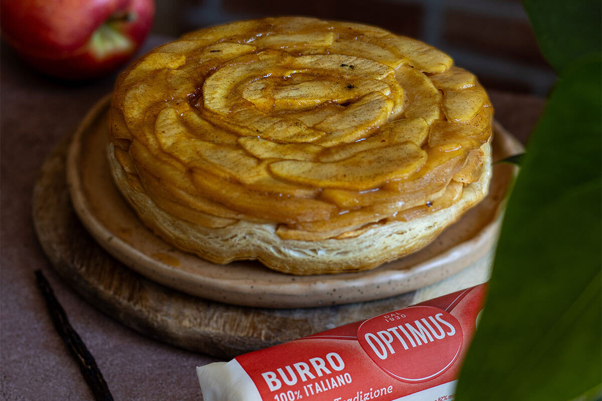Tante mele caramellate su un disco di sfoglia preparata con il burro Optimus, dal sapore aromatico e autentico. Ancora più buona tiepida con una pallina di gelato alla panna o alla crema sopra.