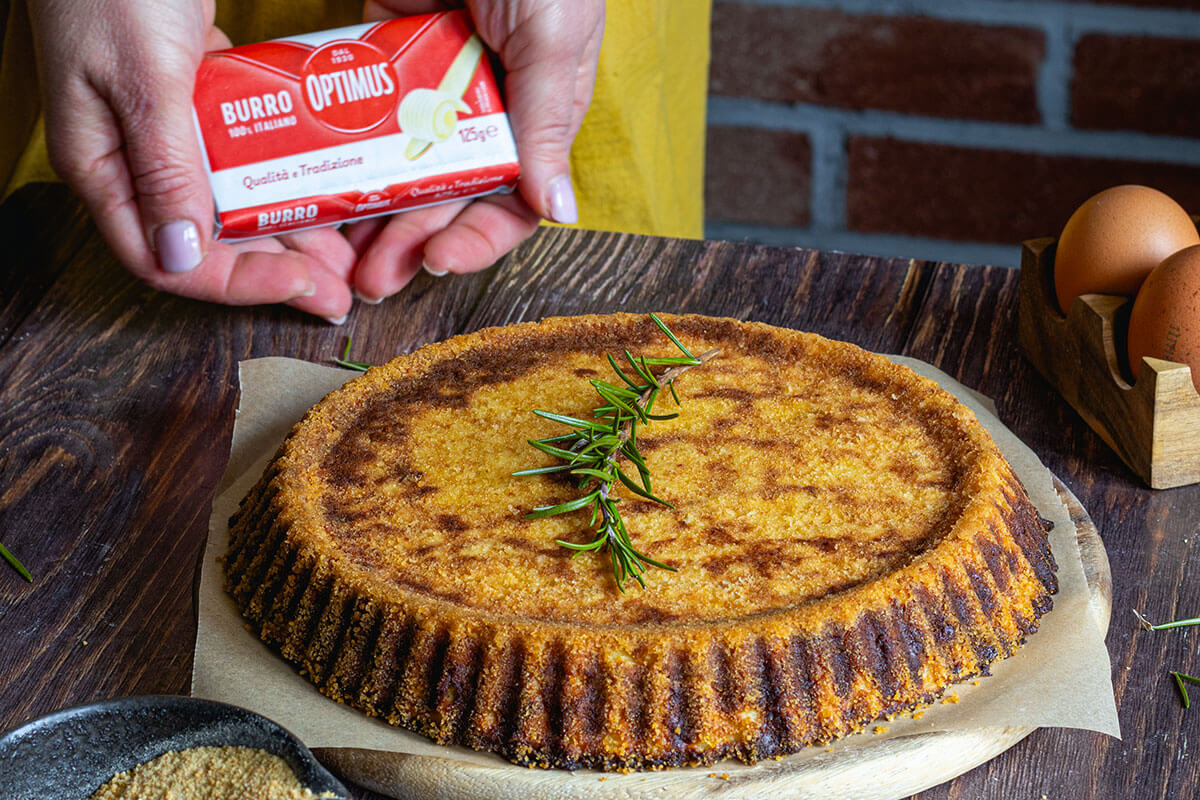 Spennella lo stampo con abbondante burro fuso e distribuisci il pangrattato su tutta la superficie. Versa metà impasto di patate e farcisci con la scamorza a fette sottili e la mozzarella a pezzetti lasciando libero il bordo. Ricopri con la restante parte di impasto. Livella bene, aggiungi il pangrattato, dei piccoli tocchetti di burro e del rosmarino.