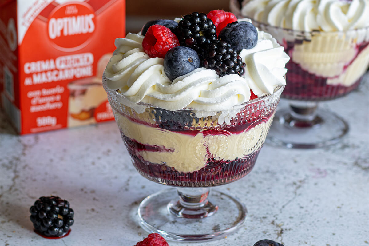 Sbriciola grossolanamente i biscotti e versali sul fondo dei bicchierini, verso 2-3 cucchiai di coulis, la crema mascarpone pronta OPTIMUS e aggiungi dei frutti di bosco freschi. Decora con la panna montata e i frutti di bosco avanzati.
